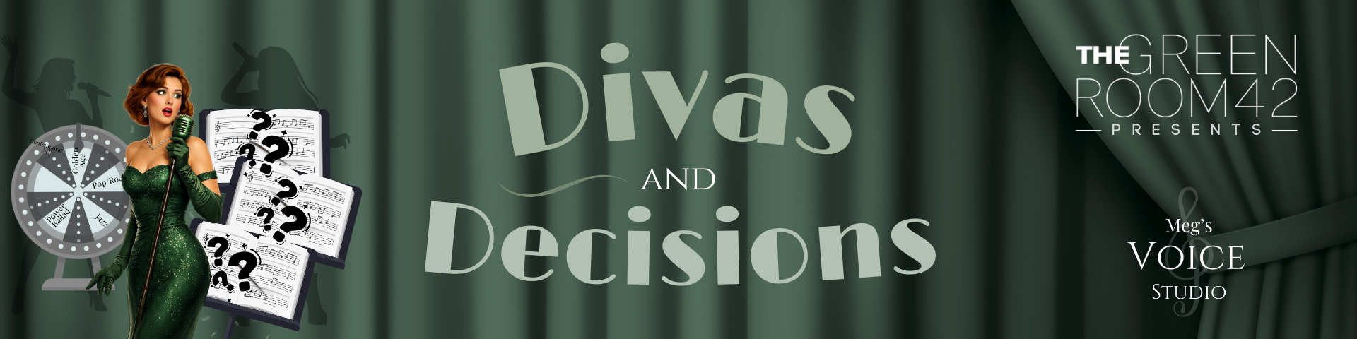 Divas & Decisions is a high-energy cabaret where bold voices meet big surprises. Performers spin the wheel and discover their song moments before stepping onstage—no planning, no overthinking, just instinct and star power. Each choice brings a new style, story, or challenge, making every performance totally unique. It’s playful, unpredictable, and all about celebrating fearless performers who are ready to decide on the fly and shine.